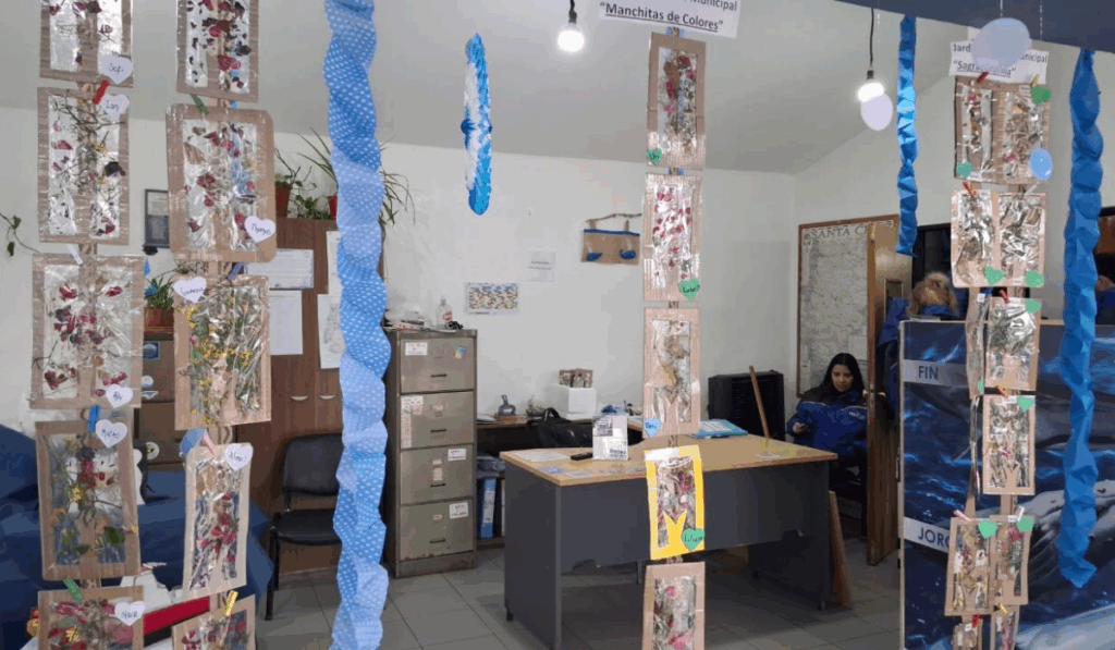 Utilizaron flores y hojas autóctonas además de cartones y pinturas para lograr collages muy coloridos. Todas las familias pudieron visitar la muestra que decoró las oficinas de Turismo, dando una impronta llamativa y diferente a la habitual. “Estamos haciendo actividades para todos los fines de semana”, remarcó Gordillo.